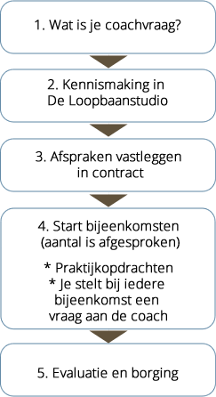 Hieronder vind je een schema van het coachingsproces bij de LoopbaanStudio, klik op het plaatje voor meer informatie over het coachingsproces bij een individueel loopbaantraject.
